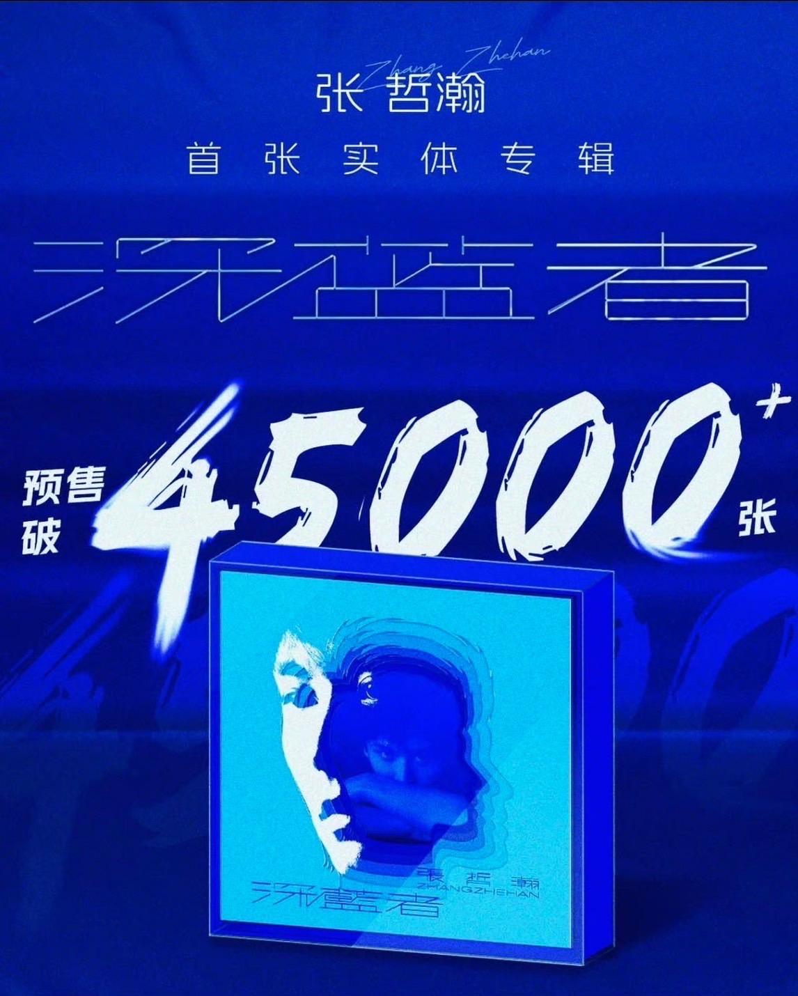 張哲瀚推出首張實體專輯《深藍者》 預購衝破45000張 親自經營社群 嘆:無法一個一個回應,但真的都有讀進心裡 2023-08-09 Zhang Zhehan releases his first physical album "Deep Blue" with pre-orders exceeding 45,000 copies. He manages his own social media and sighs: "I can't respond to everyone one by one, but I really read every message by heart."